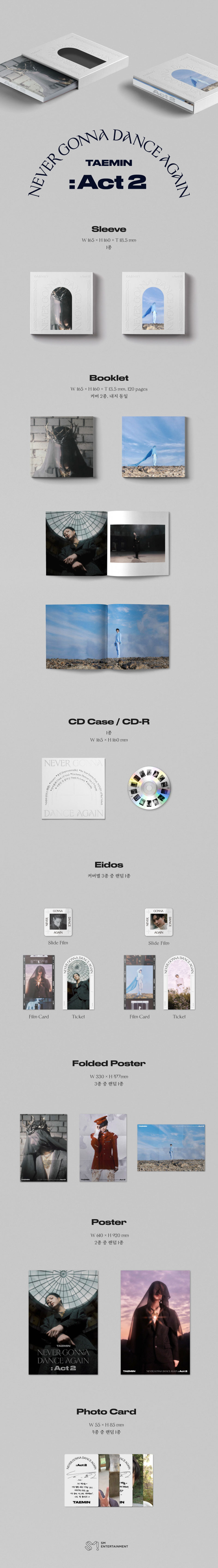태민 정규 3집 ‘Never Gonna Dance Again’은 프롤로그 싱글과 ‘Act 1’, ‘Act 2’ 2개 앨범에 걸쳐 아티스트로서 태민의 고민과 도전을 영화적인 스토리와 음악으로 풀어냈으며, 이번 ‘Act 2’에서는 태민이 새로운 아이덴티티를 찾는 모습을 만날 수 있어 기대감을 높인다.