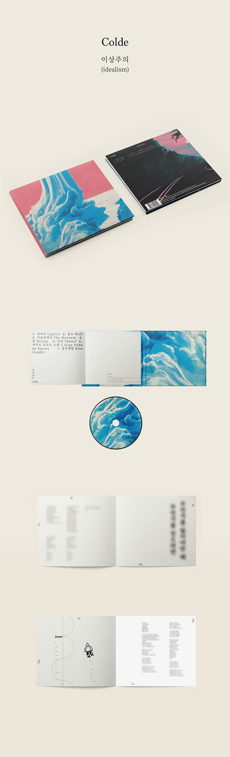 Details 이상주의 [ idealism , 理想主義 ] 어떤 궁극 목적 혹은 가치의 실현을 목표로 하여, 노력해 가는 정신 태도. 이상과 꿈, 현실 그 사이를 넘나드는 여정. 그 여정이 우리 누구나의 인생과 닮아있다고 생각했다. 나는 끊임없이 꿈을 꾸고 있다. 그리고 꿈을 살고 있다. 꿈을 위해, 그리고 꿈을 살아가고 있는 사람들에게 이 앨범의 노래들이 힘이 되었으면 좋겠다. 그리고 그 여정을 계속 함께 할 수 있기를 바란다. [Director’s Commentary] 1. 라이터 불이 붙고나면 무엇이든지 타오른다. 불은 어둠을 밝히고 이내 모든 것이 뜨거워진다. 그렇게 라이터의 불을 붙이는 순간, 여정은 시작된다. 우리의 젊음은 겁이 없고 이상과 꿈을 향해 계속 타오른다. 나는 계속해서 거침없이 앞으로 나아갈 것이다. 2. 울프 이상과 꿈을 찾기 위해서는 익숙한 곳을 벗어나야한다. 숲을 따라 가다보면 알게되고 만나게 될 무언가를 향해. "무언가를 얻으려면 무언가를 잃어야만 해" 3. 미술관에서 마침내 미술관에 도착했다. 그 안을 서성이다 어느 그림 앞에 멈추었다. 이내 움직일 수 없을만큼 압도되었다. 늘 상상만 했던 그림이 바로 나의 눈 앞에 있지만 절대 만질 수 없다. 나는 그 그림을 품에 안고서 미술관을 빠져나갈 것이다. 나의 숲으로 데려가기 위해서 4. 꿈 우리는 매일 꿈을 꾼다. 그리고 누구나 각자의 이상과 꿈을 품고 살아간다. 삶은 현실의 연속이지만 꿈의 지향점이다. 그 끝에 기다리고 있는건 현실일까 꿈일까. 아니면 현실이 된 꿈일까. 5. 터널 아무것도 보이지 않는 캄캄한 터널 안 저 멀리에서 희미하게 지나온 장면들이 스쳐 지나간다. 이 긴 터널을 지나고나면 무엇이 나타날까 눈을 감고 상상해본다. 6. 아무도 모르는 노래 눈을 떴을 때 나는 작은 방 안에 있었다. 모든 것은 사라진 채 익숙한 장면들이 눈 앞에 있었다. 꿈이었다. 펼쳐진 모든 것들이, 그 여정의 순간들이. 한참을 멍하니 있다가 물을 한 모금 마시고 책상 앞에 앉았다. 나는 다시 그렇게 아무도 모르는 노래를 만든다. 언젠가 이 노래를 누군가 들어주고 알아주기를 바라며. 7. 블루캔들 파란색 촛불에 불을 붙인다. 불빛은 금방이라도 꺼질 듯 위태롭게 흔들거린다. 허나 절대 꺼지지 않은 채 나의 밤을 밤새 밝혀주었다. 눈을 감고 다시 잠이 들면 그 꿈이 펼쳐지기를 바라며 공책에 그 장면들을 적어내려간다. 촛불이 꺼지고 나면 나는 다시 라이터를 켜야한다. 다시 불을 붙이며. 그렇게 나의 꿈은 계속 될 것이다. 영원히. 8. 얼마나 시간이 지났을까 꿈인줄만 알았던 나의 이상은 현실이 되었다. 지금 이 글을 읽고 나의 노래를 듣고 있는 당신 덕분에 누구든 이상과 꿈을 잃지말고 현실을 살아가길 바란다. 우리에게는 늘 꿈을 쫓아갈 수 있는 빛이 함께 할테니까. *앨범 사양 - BOOKLET: 28P / 1ea - CD: 1ea